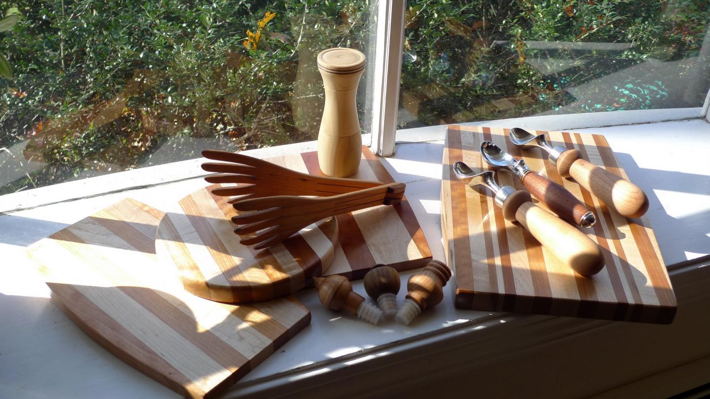 My table will have turned wooden bowls, salt & pepper grinders, laminated maple/cherry cutting boards, wine bottle stoppers, cherry 3 legged stools (great for next to fireplace or wood stove), and Blond Terror Striper Plugs.