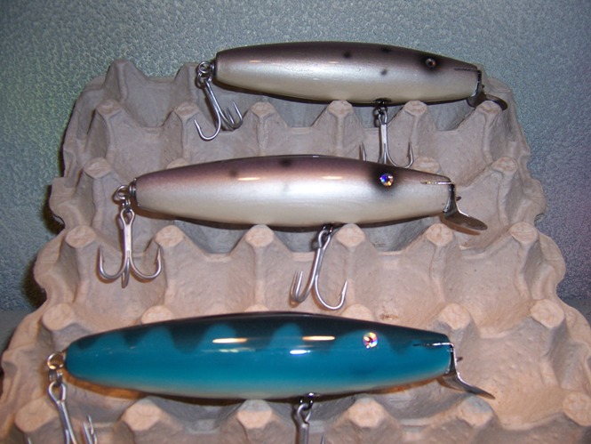 First pictures are of full sized goo-goo's 8" long... through wired.. 3 ounces made from WRC... I actualy turned these last summer as i ran short on supply.. i just got around to putting hooks on these now..... I'll be making more..( one with black body gold scale and white eye shadow for Salty dogs name on it)