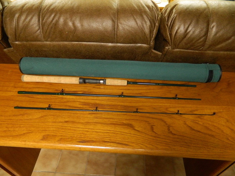 St Croix 3 pc travel rod in tube case. 7', 8-17#, 3/8 to 3/4 0z. Green blank, Like New 9.5 out of 10. Model TC70MF3 Conventional.