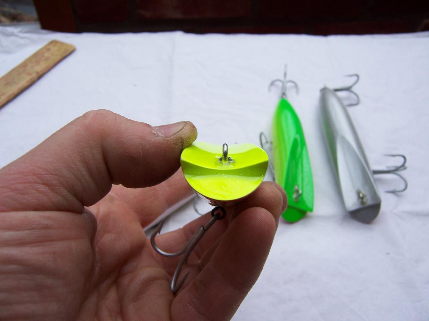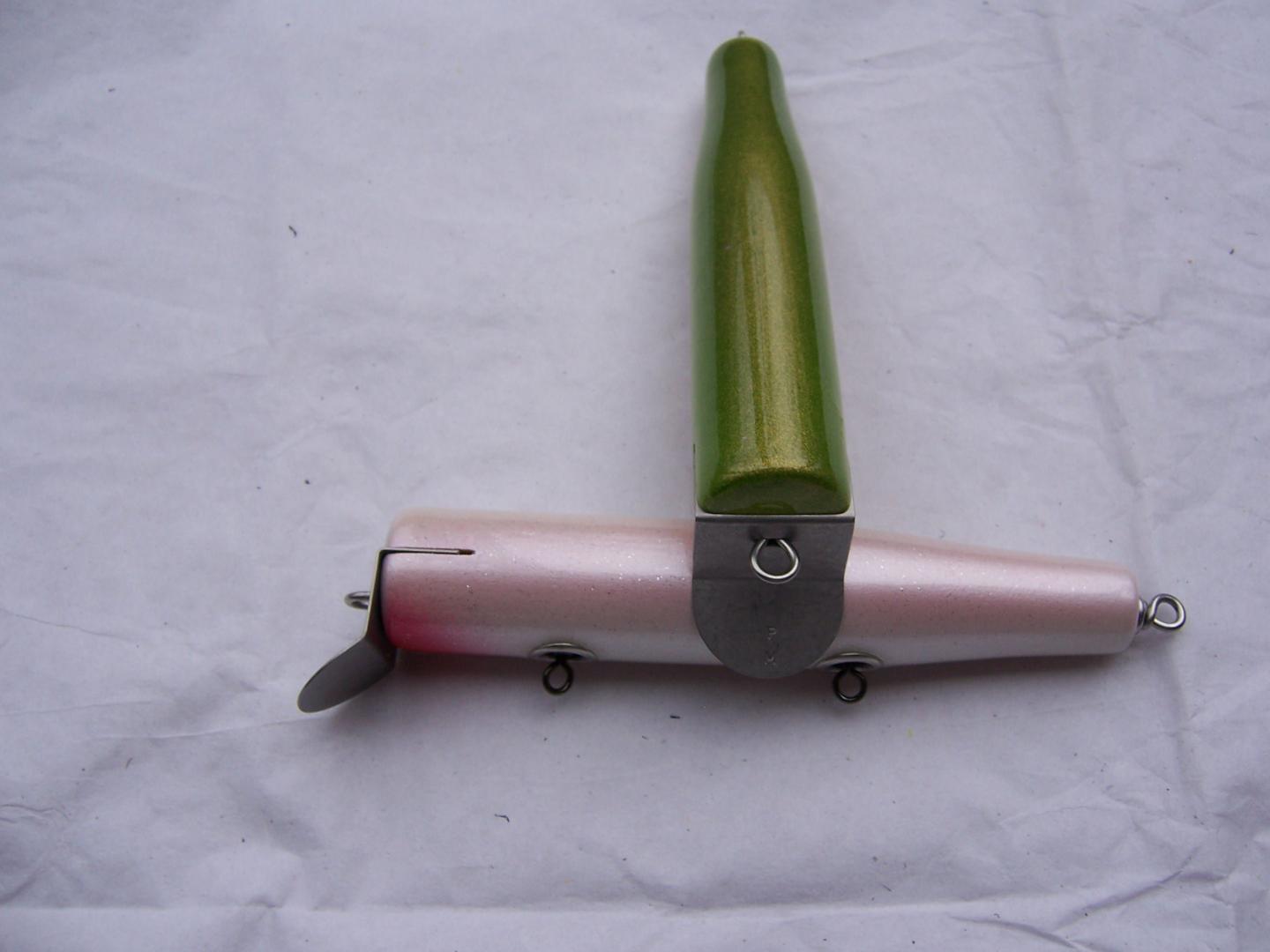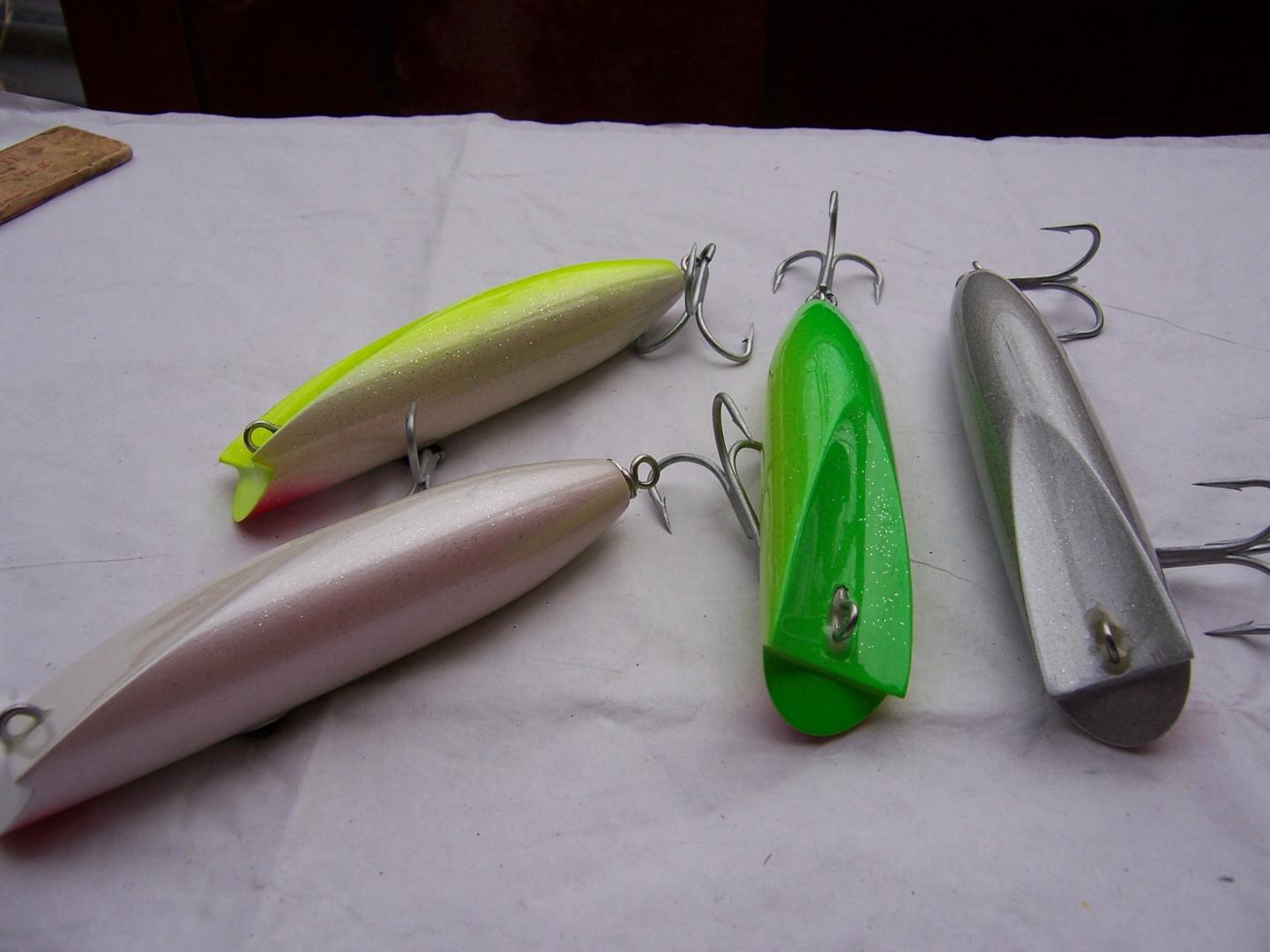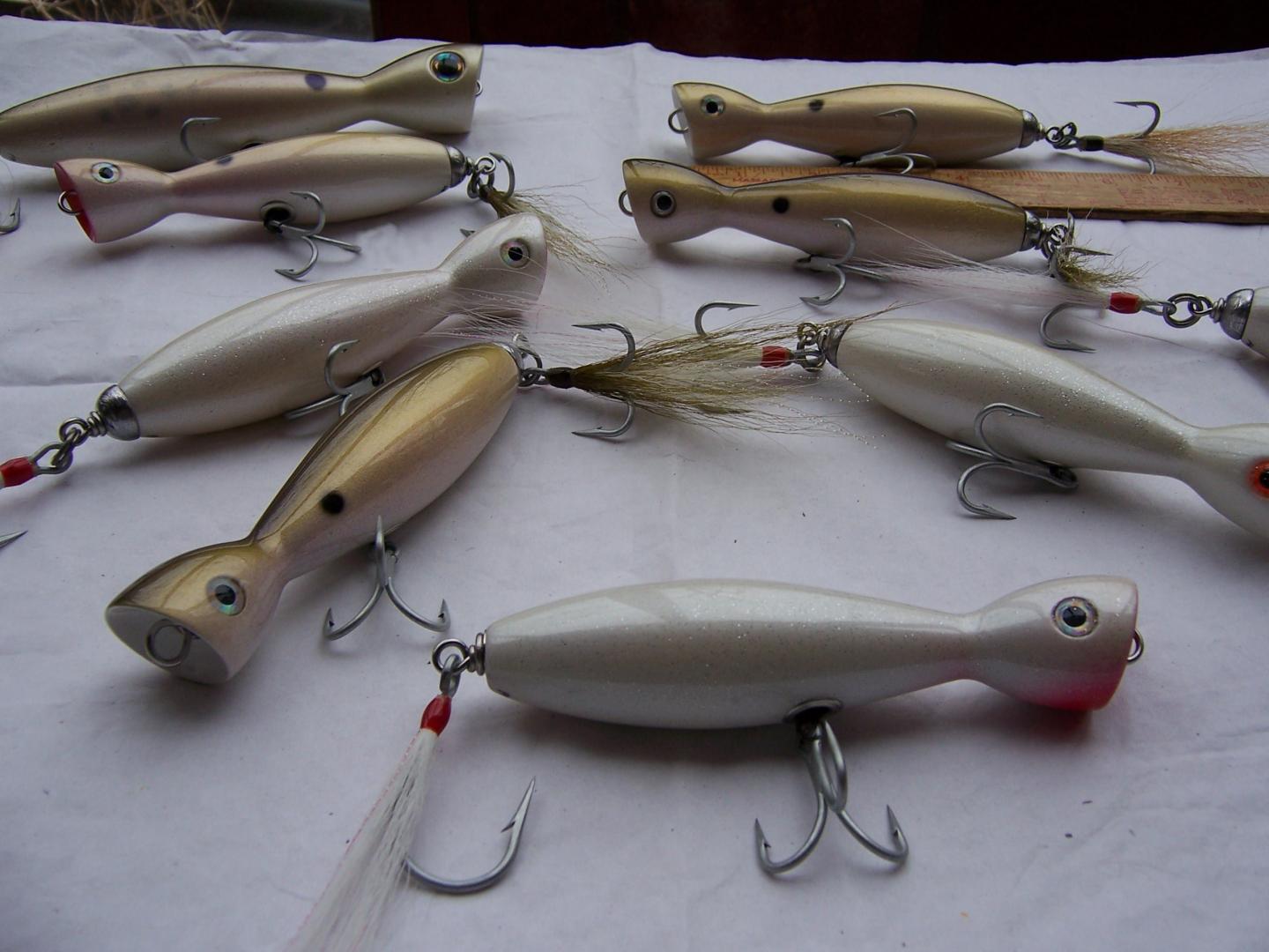These are my heavy canal poppers. Very small, maybe 5 inch and 2 1/4 oz. A normal size one I make is in upper left corner for size comparison. They cast as good as any I have thrown and pop good too. A very good producer for me last several years. The siwash no exposed tail wgt. ones are much lighter and for boat. They will pop and swim nicely.