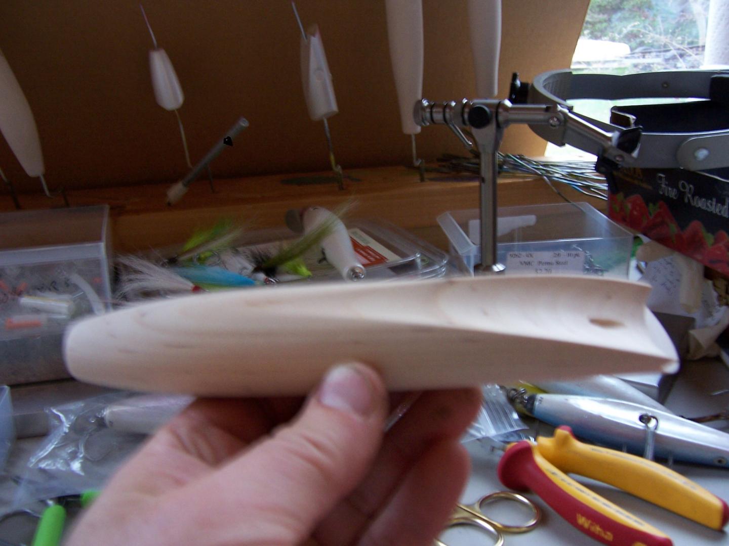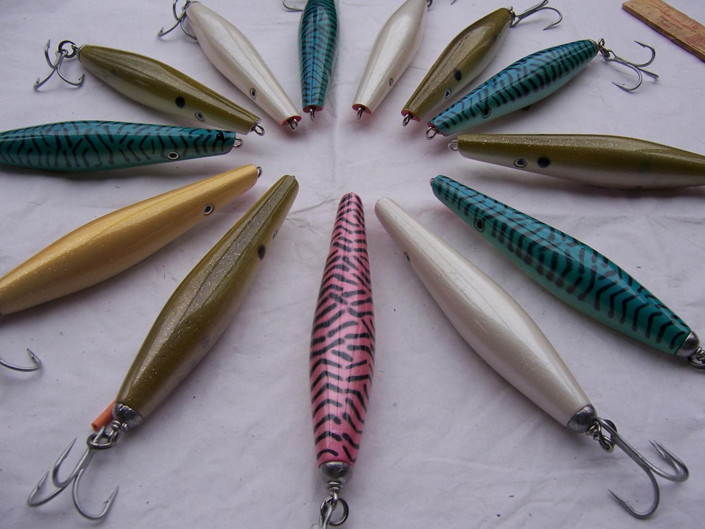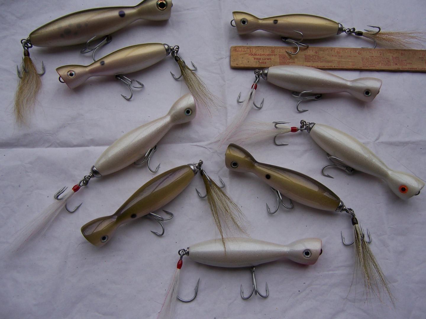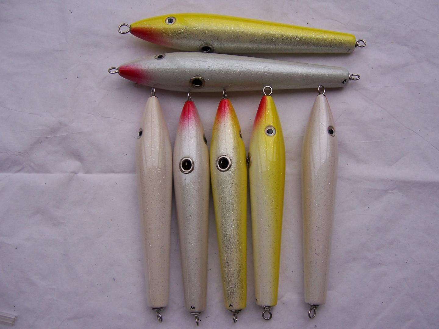 These are my heavy canal poppers. Very small, maybe 5 inch and 2 1/4 oz. A normal size one I make is in upper left corner for size comparison. They cast as good as any I have thrown and pop good too. A very good producer for me last several years. The siwash no exposed tail wgt. ones are much lighter and for boat. They will pop and swim nicely.