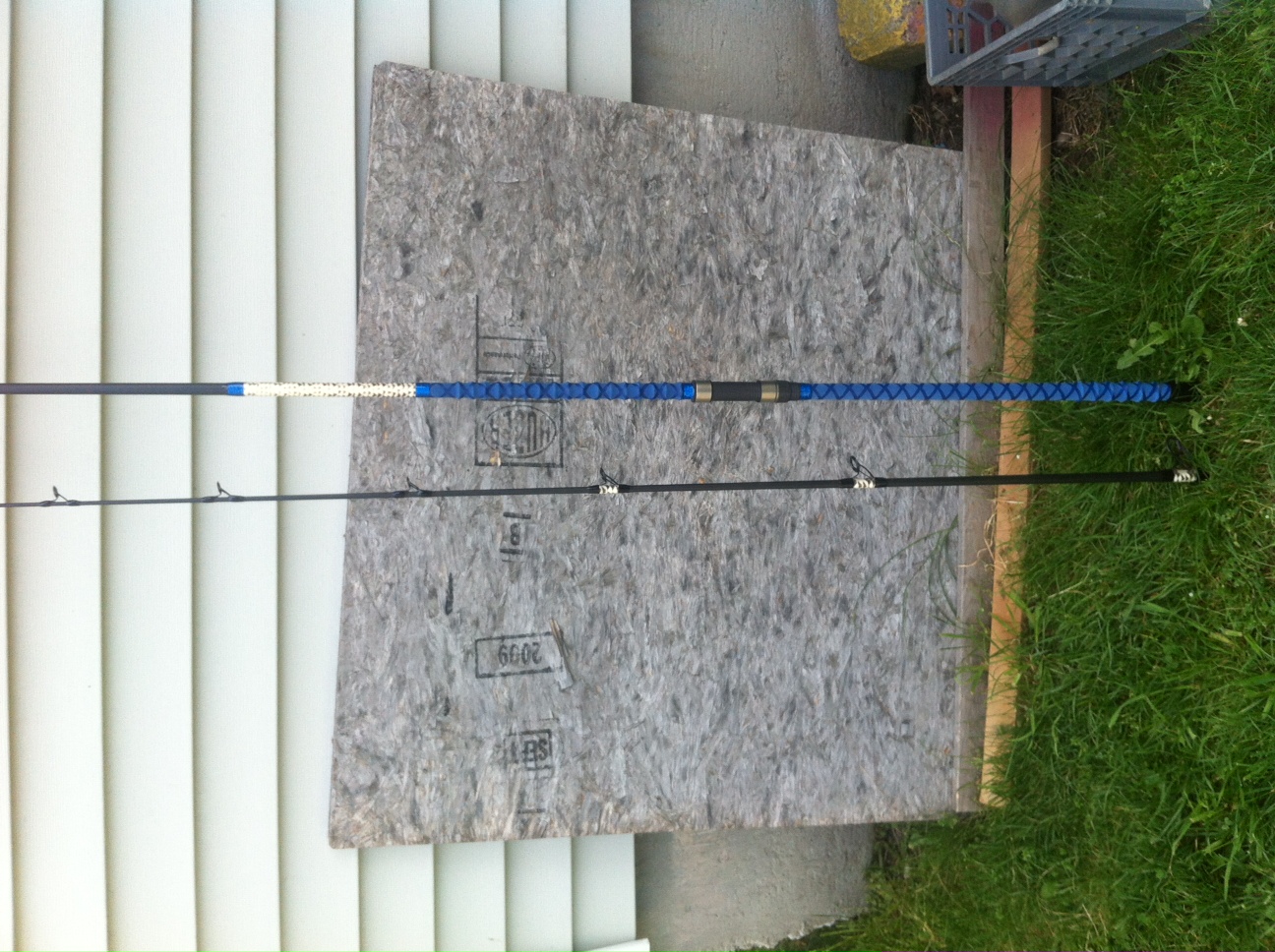 I built it in march and only test casted it after it was built, has baby blue x flock grip with o rings underneath for added grip, snakeskin crosswrap and snakeskin under wraps on the first three guides, fuji alconite k frame guides, fuji deluxe reel seat size 20 will hold all your standard reels, slim butt cap, metallic blue wraps on reel seast and skin. all high end components.