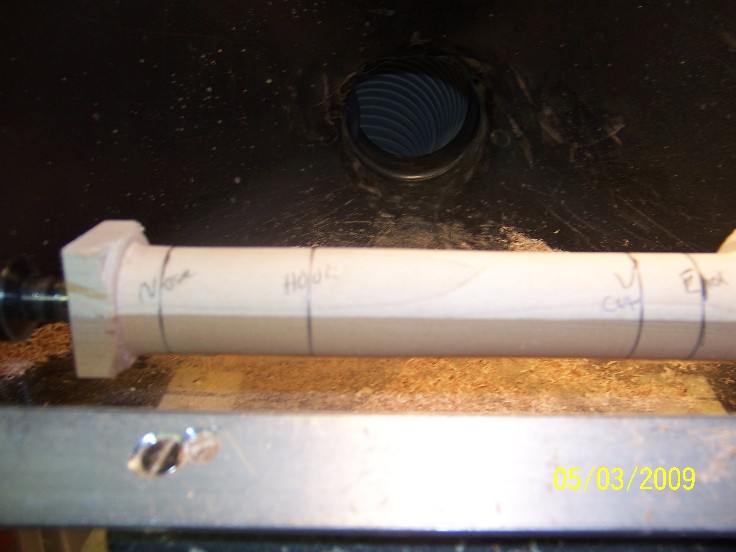 Repeat the process witht he rear blank, marking out a 5" section and rounding it out to 7/8".. the rear taper starts 1" from the front of the rear half and gradualy tapers to 7/16" at the tail...