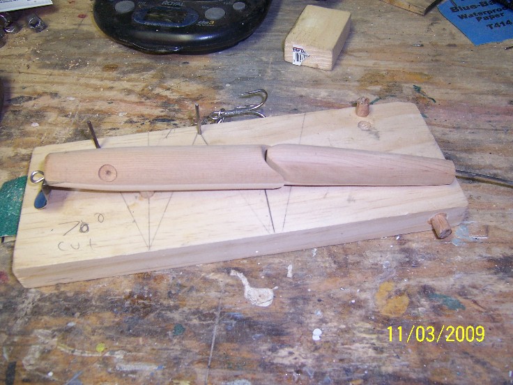Making the V cut... the V not only makes the plug stream line, but by using a tight joint, the sides rattle as the plug swims along, slapping from side to side, this was by design, as I tried my best to make a rattle work on this plug, normaly, I instal them between the eyes, no could do here, just too narrow, so the next best thing.. a working body... this wouldnt be possible if the plug were not epoxied...