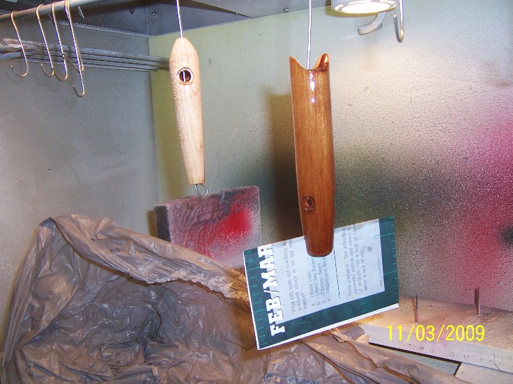 Priming... normaly, I use Zinsser oil based cover stain over my BLO ( oil over oil) and apply it with an automotive type spray gun ( I've got a 850 cfm blower in my paint hood that exausts outside)but in cases like this where the plug is sealed with something other than BLO, I'll use the Zinsser shelac based primer , the plug will have a glass like finish, IMHO, not good for paint adhesion, so I scuff the plug body up with #220 paper... remove your wire and give the plug one final inspection, be sure the through hole is clear, it is alot eaiser now to do a repair then it is after you have the plug painted and then discover the through hole is blocked!