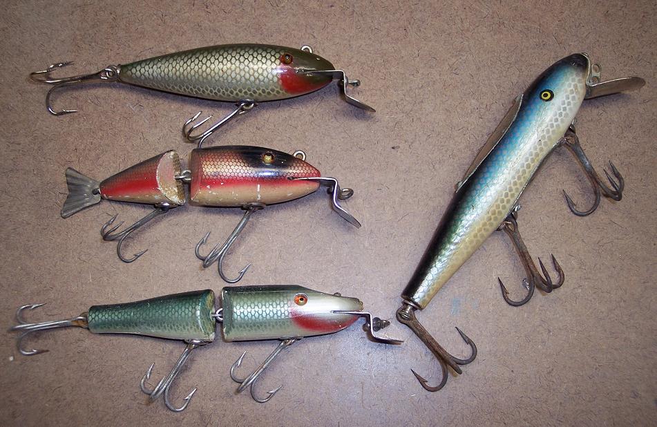 Here are a few Creek Chubs I will use for inspiration! I like the Wag-Tail but after swimming it I think the rear section needs a little more weight as it just kind of "drags" behind the front section instead of actually swimming.........the jointed in the bottom left corner might be one of the sexiest swimming plugs I have ever seen! Gonna copy that one to a "T"! The Wiggler (top left) is the size I am looking for.....it swims a little too "nose down" for my liking as I want it to swim more level and wiggle a bit more than it does. I do not think the hooks Creek Chub used benefit the action on these plugs at all due to the fact that more often than not they are not able to swing freely due to the screw eyes holding them.....thru wire and sivels will help with shorter hooks for sure!