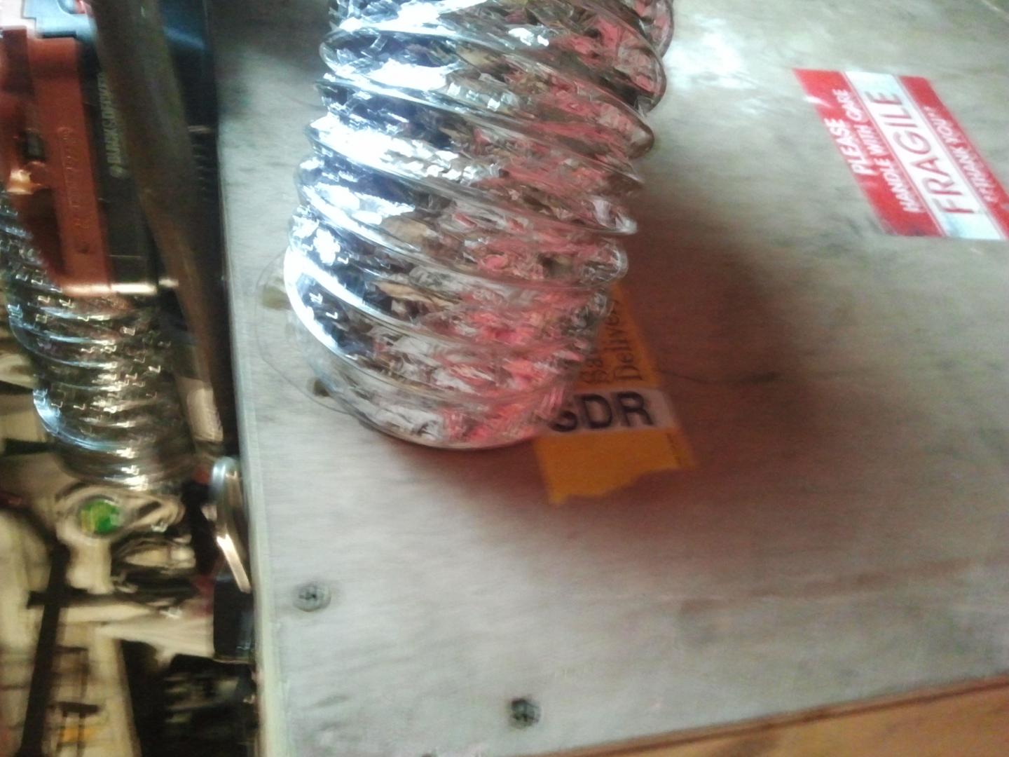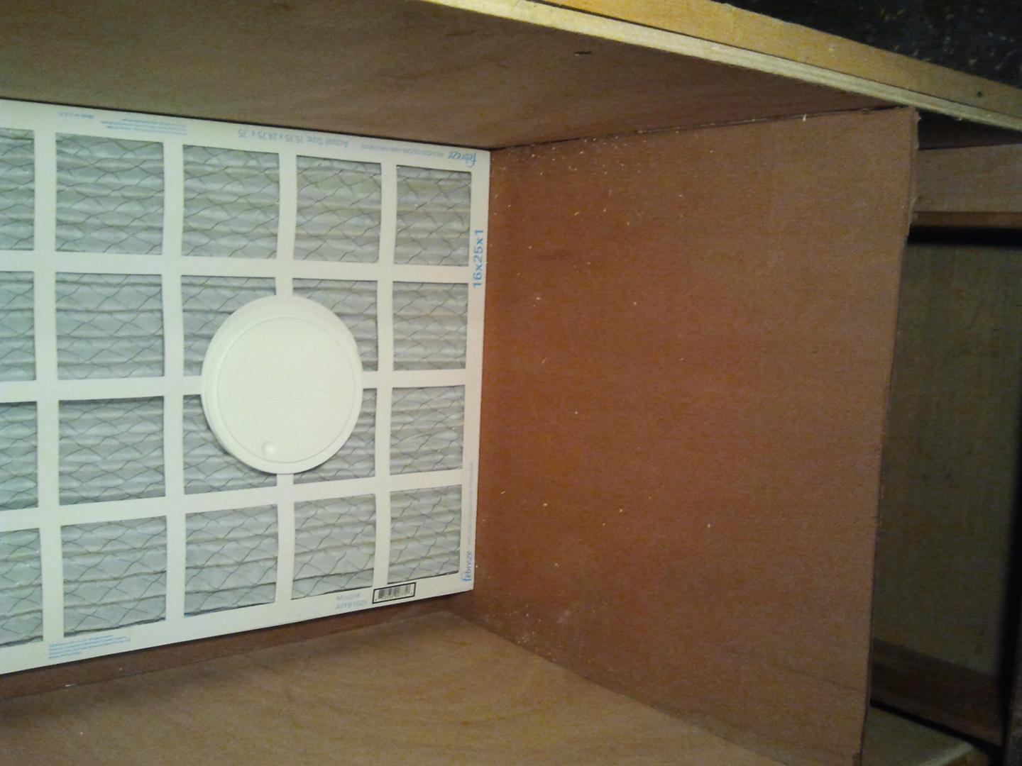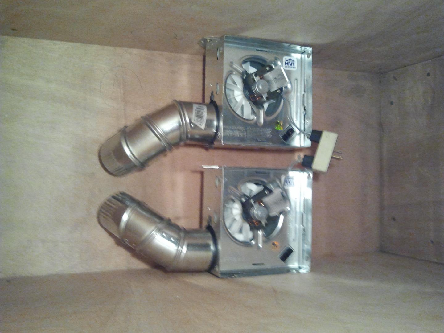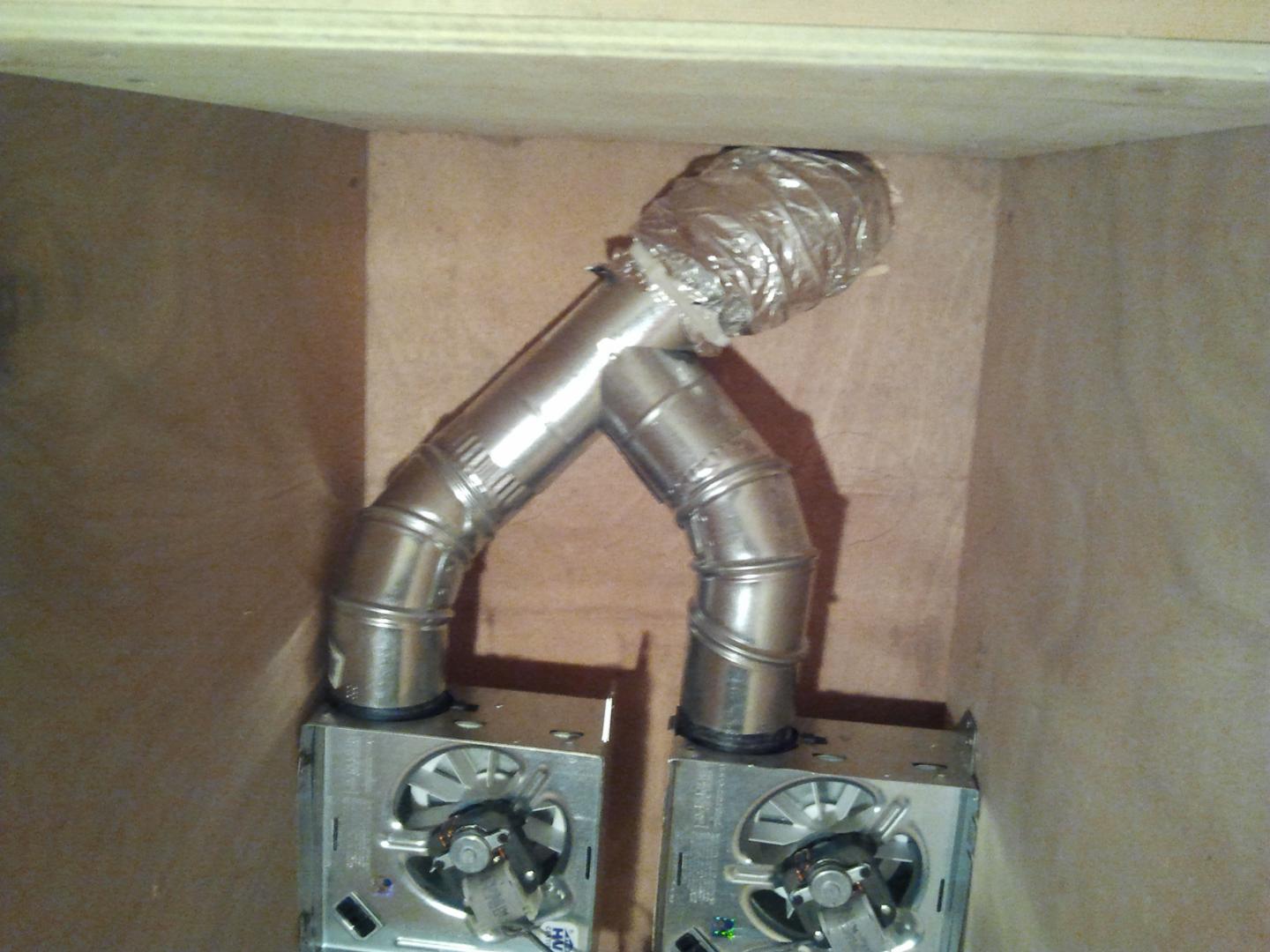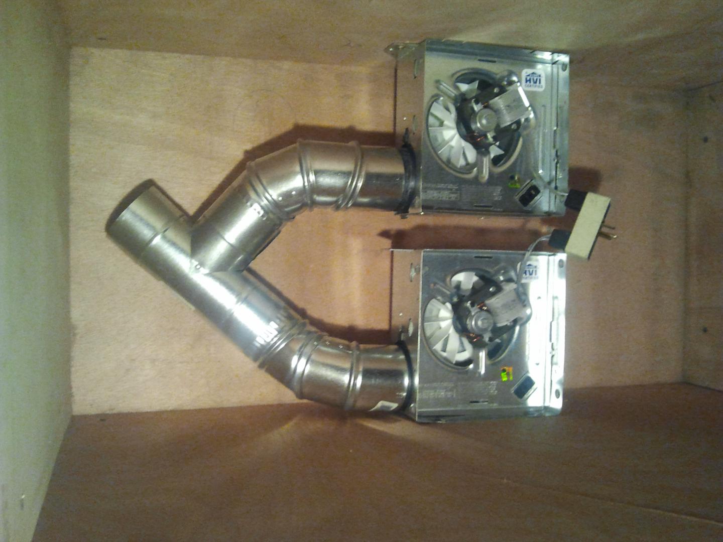 Well, here it is. I'm sure it's not much to some people, but it was by far the most technical thing I've done thus far. It has 2- 50 cf/m bathroom vent fans. The vent off the fan was 3", so I used 3" 90deg duct brackets to a 3" T, then fed that into a 4" flex duct. I couldn't seem to find any 3" flex duct, so I used a zip tie to snug it down. A few screw in hooks and a hanging wire should give me options depending on the size of plug I'm spraying. Used a 17"x25" febreeze furnace filter.