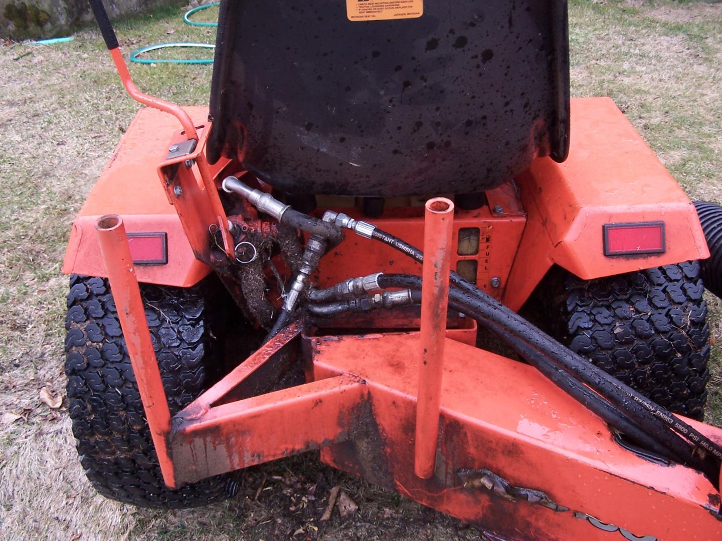 Ingersol 3014 tractor...........AS you can see in the second and third pics the housing for the hydraulic vacuum. The taped side is what is rotted. I bolted the sides together and it still works very well. That housing can be replaced. The parts can be bought. The hose is almost brand new that runs from the tractor to the hydraulic vacuum. I replaced the hydraulic pump about five years ago as well. The large arm that extends from the back od the tractor towards the vacuum comes off and the same bolts used to secure the arm with are use for securing the log splitter tyo the tractor.