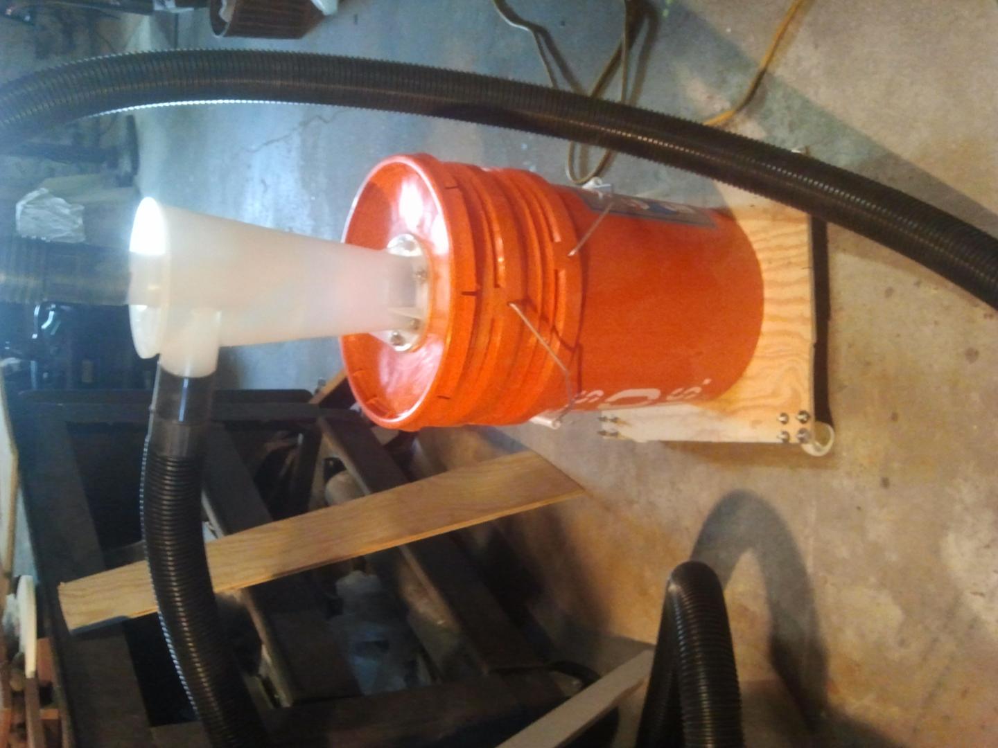 Picked up an Oneida Dust Deputy cone at woodcraft the other day. I only bought the cone, not the full kit. So here's how I did it. I bought some gasket material from HD and a bucket too. Cut the 3" hole in the top of the lid. After cutting out the gasket material, I snugged it all up with 1/4"x1" bolts and silicone sealer. Works the balls!!