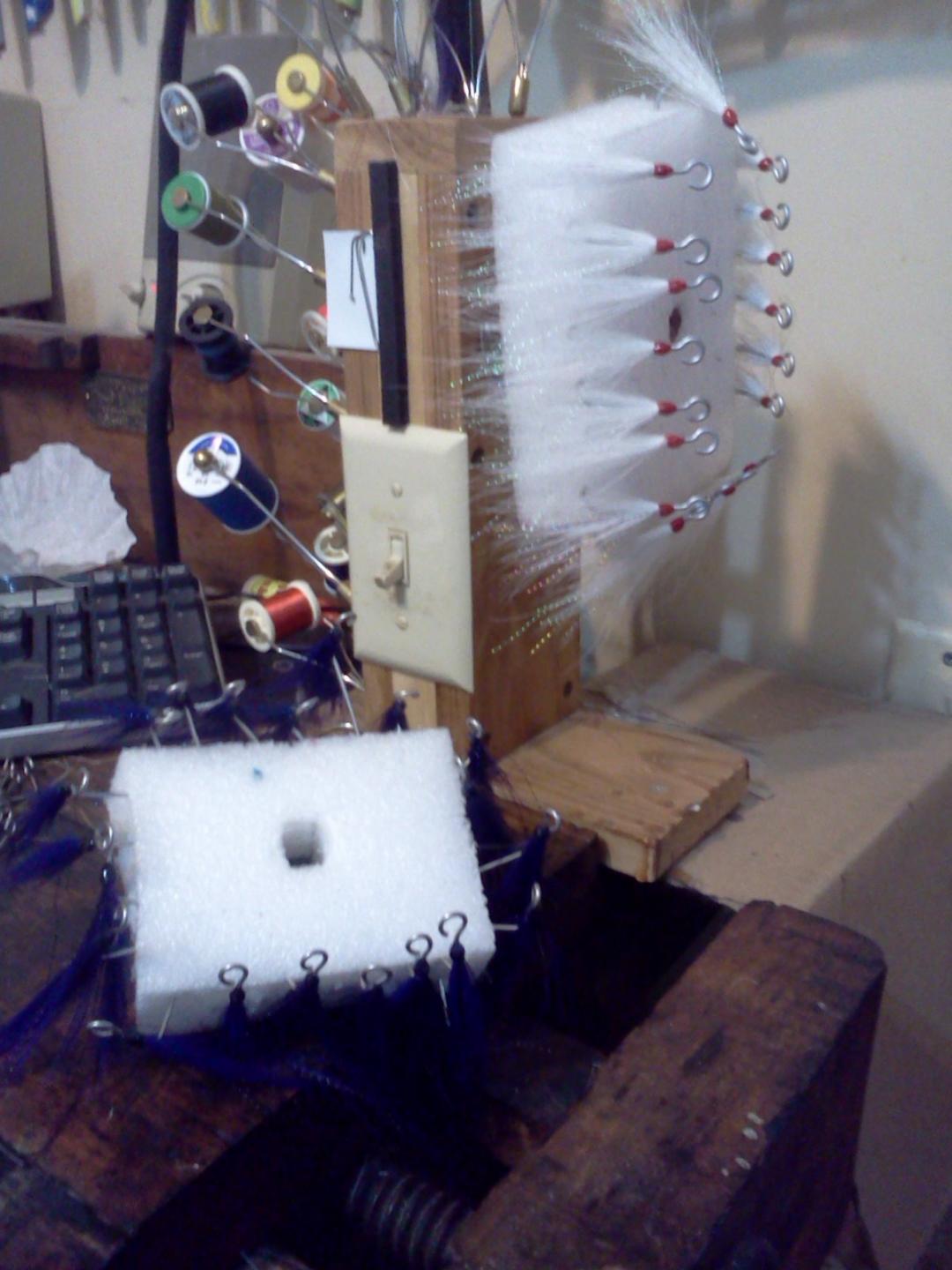I found 8 Pike bodies ready for prime. Hiding in my plug draw!! Painted them and have 2 coats on them. May add a third. I use 12cc for 8 pikes. 8cc/4cc ratio. 1" foam brush. Slow strokes on finish drag. I hang the Pikes upside down for 20min or so the flip tail down. Have heat lamps 4' away from them shining 12 hrs. able to handle them next day.