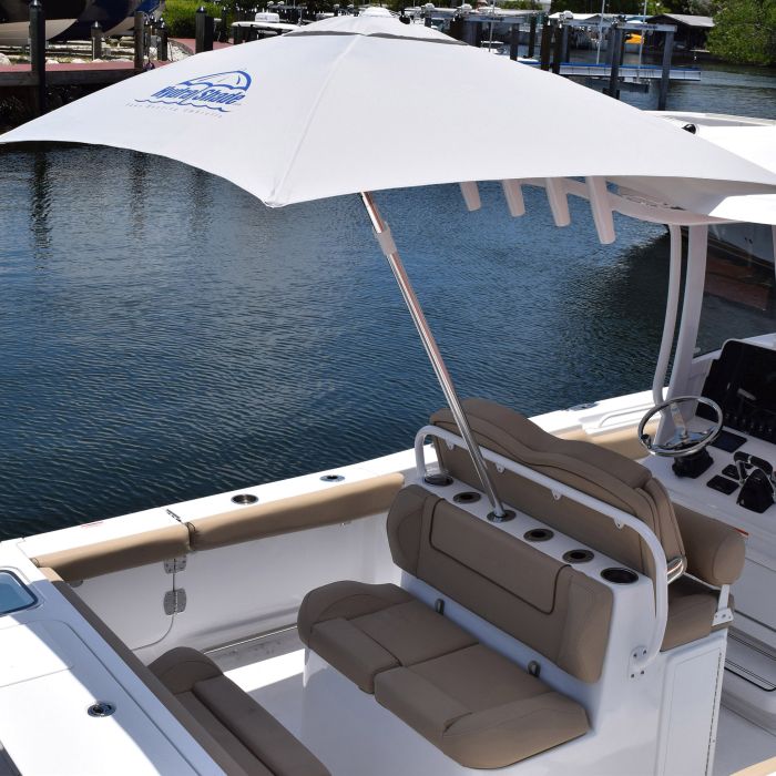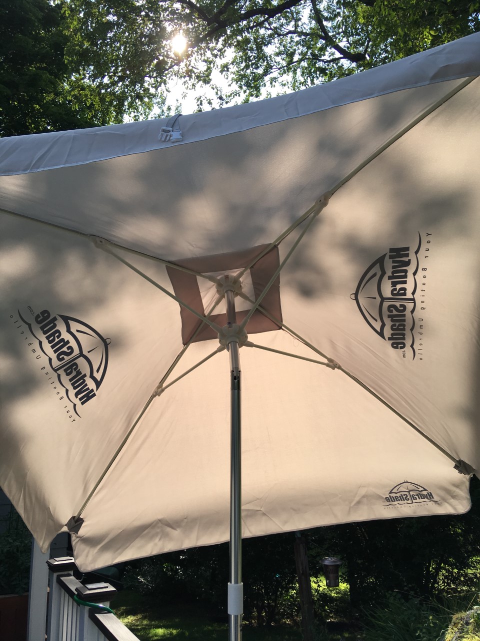 Hydra Shade boat umbrella. 8' open. Tilts. Bought two years ago and took out of storage bag to take pictures. Never went on boat and boat not going in this year... Bottom base locks into rod holder securely. Paid 175 shipped Sell for 100, meet up or plus shipping. Does not have sand screw shown on website