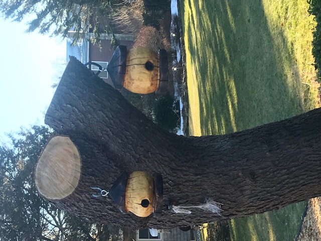 With a break in the weather I was able to get a coat of timber oil on two bird houses I made from pieces of the choke cherry we lost in that first nor'easter. Hung them this morning with the bottoms with a good bed of saw dust and shavings and sparrows are already using them. The Carolina Wrens are loud and doing their thing, we had about 50 robins this week bathing in the bird bath and picking every last berry off the hollies and spruce trees........its coming.