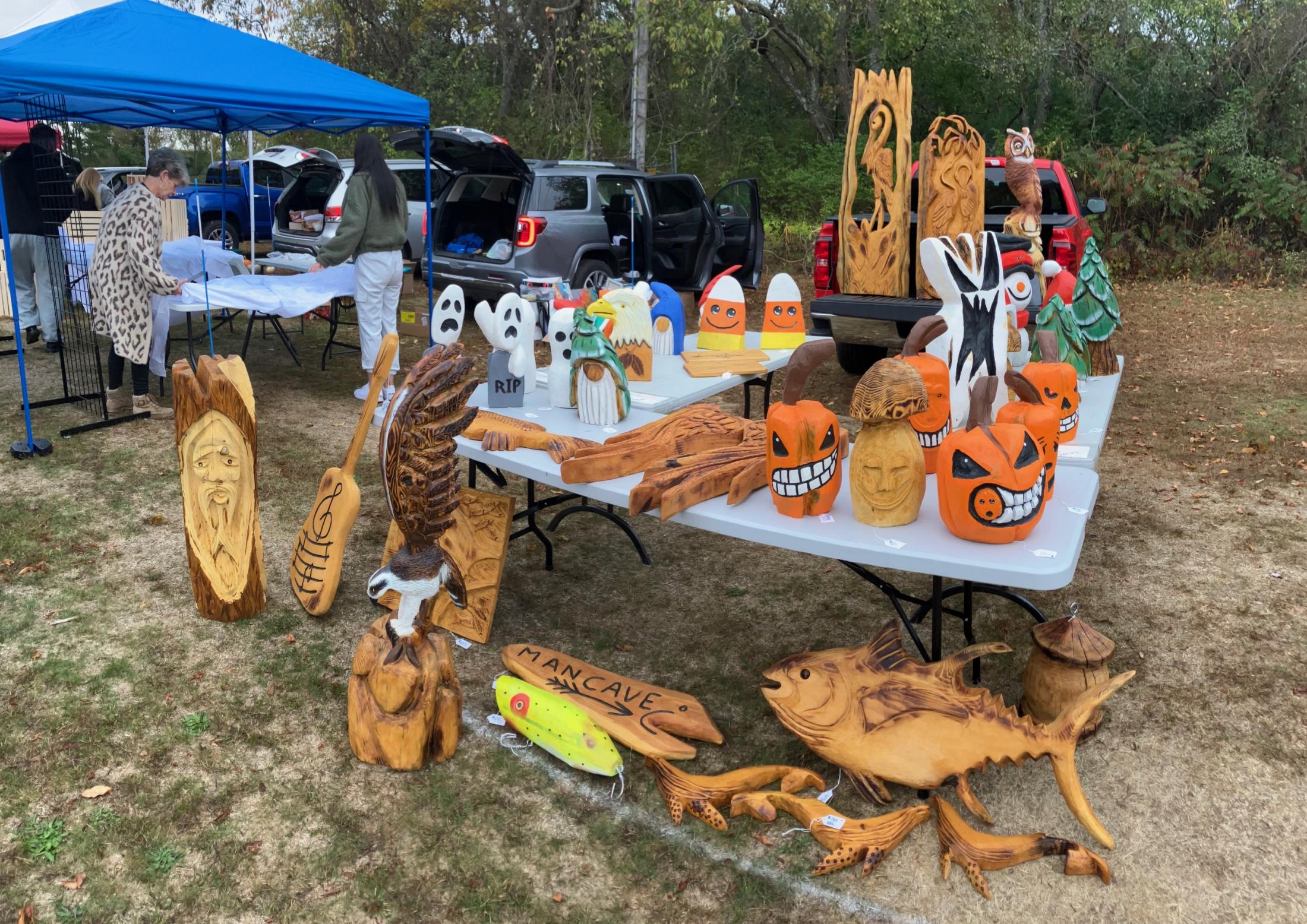 I will have about 40 carvings at the Soule Homestead Education center in Middleboro, I will be there rain or shine. Owls, tuna, striped bass of course, patriots logo's, pumpkins, whales, Xmas trees and gnomes, the list is long.