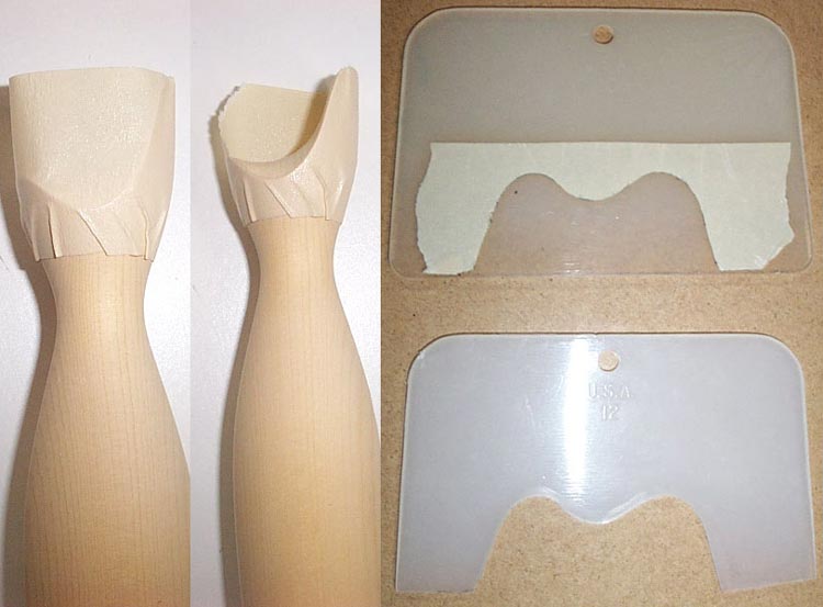 Once you have a shape you are happy with and swims well, this is an easy way to preserve that shape. Wrap a piece of 1 1/2" masking tape around the plug,overlapping in the back.use an exacto knife or a single edged razor blade and carefully cut along the edge of the lip. Peel off the tape and transfer it to a piece of hard plastic that you can cut easily, I use bondo spreaders. Trace and cut out the shape in the plastic, now you can lay 2 or 3 pieces of tape over the plastic and cut out the exact shape very quickly. Usually after 4 or 5 tracings the stickiness has left the tape and I'll grab a new piece depending on how may I'm tracing.