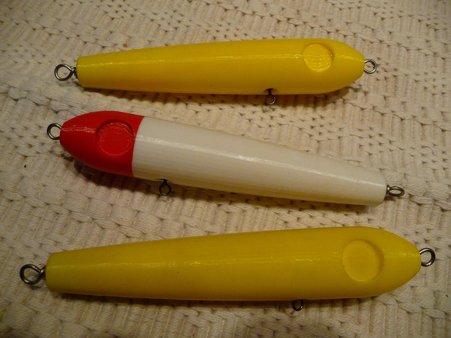 I know this is a wooden plug building forum but here are a few Seapups that I printed on my 3d printer. 1 1/2, 1 3/4 & 2 oz. Material: ABS. Very tough. Interior is honeycombed not hollow as are most injection molded plastic plugs. Color is all the way through. They were 3d modeled in Solidworks and printed on a Makerbot 3d printer. They take about 2 hrs and twenty minutes to print and come out complete with wire through hole, hook and weight c'bores and eye sockets ready to finish.