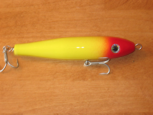 A mackeral pattern giant yozuri type pencil weighs 4.6 ounces, 5/0 treble in rear, 4/0 on belly. ayc , 2 coats of clearcoat scuffed then 2 coats of envirotex.