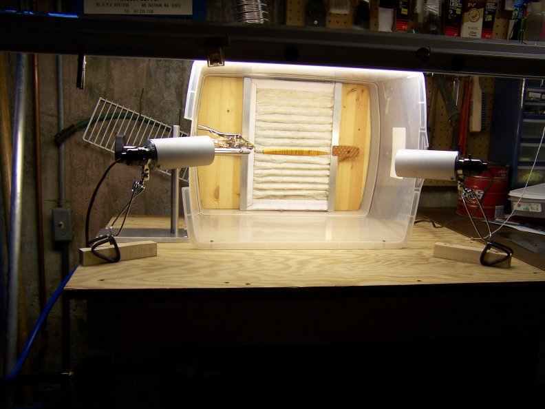 1 Rubbermaid "Under the Bed" storage container. I only recommend using Rubbermaid products for any application that might involve drilling or cutting holes. The other brands all seem to have a tendency to split while you're drilling them.