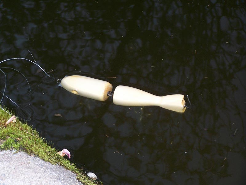 Well with gas prices what they are I decided to dunk it in the backyard instead of the ocean. The Weasel sits high in the water at rest. I was a little dissappointed when I slowly moved it across the "pond" as it moved like a stick. But when I gave it a pop it came alive. The wiggle was enough to throw the rear hook.(non crimped open eye) Needless to say the goldfish scattered when I put this thing in with them.  It will be painted next week.
