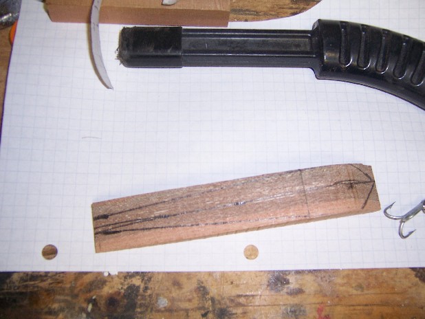 The plug is 5" long 15/16 wide at its head and tapers down to 1/4" at the tail, the joint is made from brass toilet chain links ,the lip is cut from lexan( the bill is 7/8" wide and 1 3/8" long) and placed at a 30 degree angle 1/2" deep and 1/2" back from the nose,#4 SS screws secure the liks on the side and belly, I used 3/4" long screw eyes that were secured by a drop of 1 hour (water proof )epoxy, I got the original specs from a 5" nils master minnow and tweaked and jointed it to fit my own needs..it swims down about 12-18" (Mahogany) with a tight frightend minnow action....