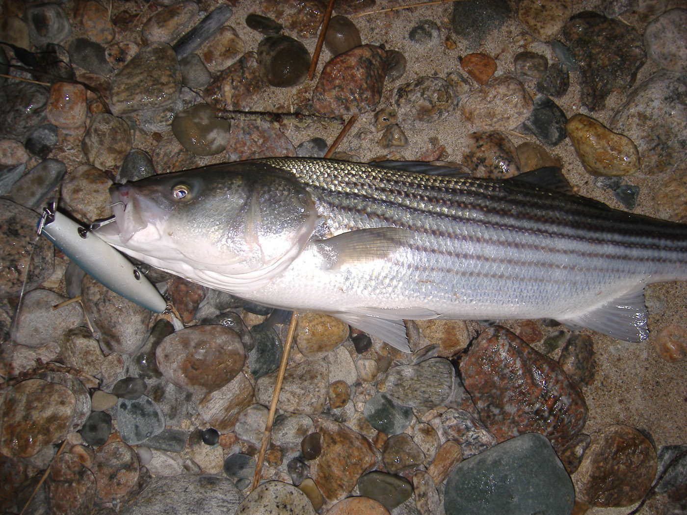 Yikes! I caught one! Only @12-13 lbs, but the first success I've had with these lipless swimmers........which I now feel more confident using. They cast great and swim great, but waves seem to interfere with their action and that sort of negates their casting advantage over metal lips. Pissa swimmer for slow water in the canal, though