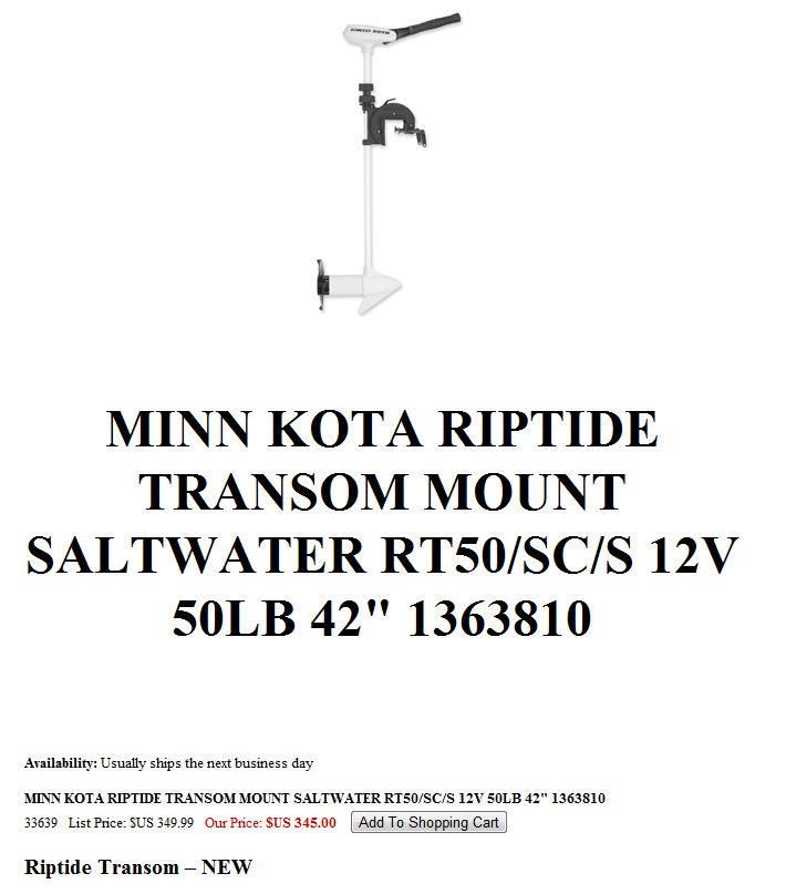 MINN KOTA RIPTIDE TRANSOM MOUNT SALTWATER RT50/SC/S 12V 50LB 42" 1363810