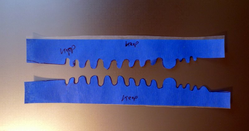 I then trace the profile using a thin Sharpie onto the blue painters tape. Next I remove the stencil flip it over and tape it down to another piece of blue painters tape to make the tape stencil for the other side.