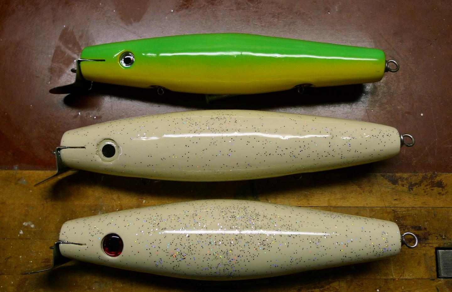 Chunkah gave me a couple of his pleasantly plump pine dannies in trade for some pine stock that used to be my kids tree fort. His design (red eyed white one) is one sexy plug... weighs a tad over 4 oz with 2 cut 3/0s and a flag.