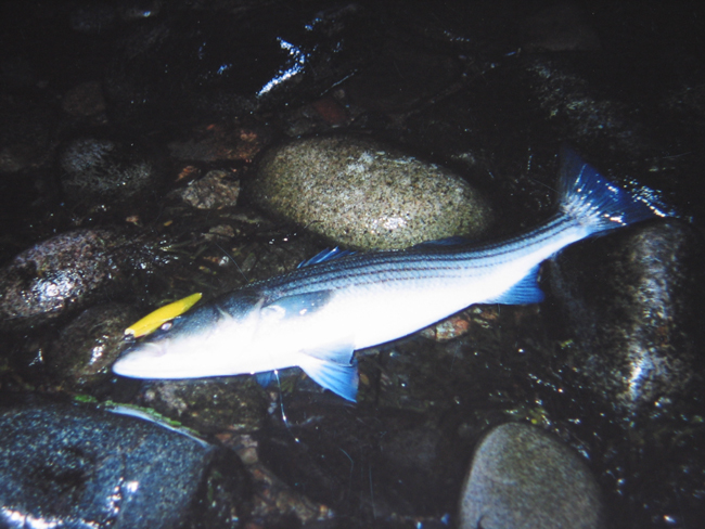 my poppers work. on the vinyard last night, fishing my poppers. tuns of blues and a few schoolies to 28". a best on my own wood so far, let the bass go. kept 1 blue that managed to get every hook on the 2 trebles inbeded in it. bernzy needles and BM poppers work too. heres my bloody hand and the plug that caught most. love giving my plugs battle scars.