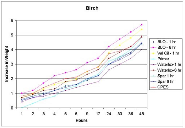 If I move away from epoxy-sealing birch it will probably be towards spar varnish. Based on Woodbuster's 2008 testing on SOL (below), it seems spar varnish did better than Val Oil.