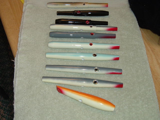 Guess it really depends on what you mean by "do at one time". You mean start to finish? Or all at one time? I'll often turn several blanks one night, a few the next, etc. or do up a whole bunch on a weekend. Once I get a bunch up, I'll seal them all one night, prime another, then paint a final night. Less clean up and wasting of materials that way. Like right now I have around 50 waiting to be primed. If I am just playing around with a new idea, I'll do up a few and try different weighing, hooks, etc. until I get the action down right. Once that is good, I'll paint a couple up and see what the fish thing. If they like, I'll do a bunch more. So, to answer your question, between 1 and 50