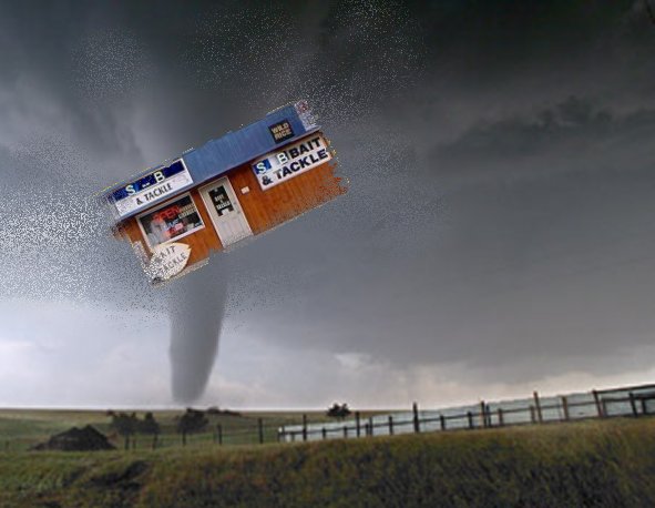 He says, "Yes ma'am, the rod and reel is $20.00, the duck call is $3.00, and the catfish stink bait is $2.50."