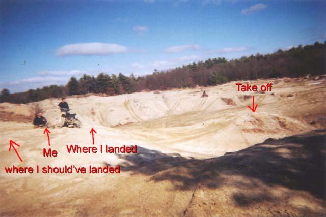These pictures are from the carnage that happed when I came up short on a 100ft step up jump in the desert in west greenwich a few years ago. See my illustration? Theres me, cannot stand because I shattered my Tibula again...and also got quite a few stitches in my chin.