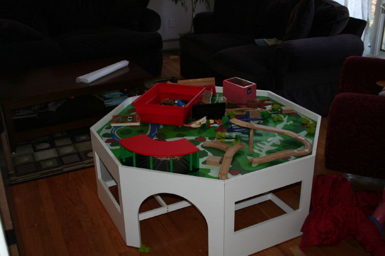 Got this 3 years ago, my kids never play with it and it becomes a junk pile. Its pretty big, takes up a lot of room. The tracks have been glued together a few times and a few of them are broken/cracked on the joints where they connect. Noting some wood glue wont fix. We have the instructions with the track configurations. Comes with a garage, bridge, mountain/tunnel. It has bins below it for toy storage. I believe its made by Battat. No trains included. It comes with a lot more tracks than in the picture.