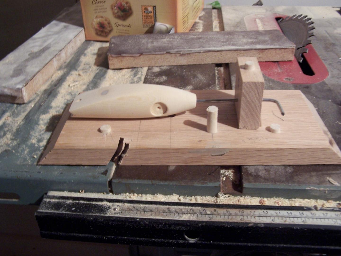 I don't have the equipment to make metal fabrications, so I take inventory of my needs first then check around and see what I have that fits the bill. This bottom of this jig is made from leftover flooring from twenty years ago and as you can see 3/8" dowels,(same size drilled hook and lead weight holes). Also I made a backing plate from the same stock that I made several pertinent holes in it that can accomodate an 1/8" metal rod for stabibilty. The rod keeps the plug from moving laterally while I run the plug through the table saw blade. I generally make a cut 9/16" in depth for the bottom lip and 1/4" for the top lip and then cut off what I don't need for the top slope of then plug in question. Its simple, inexpensive, and works surpisingly well. Well here is my little gem.
