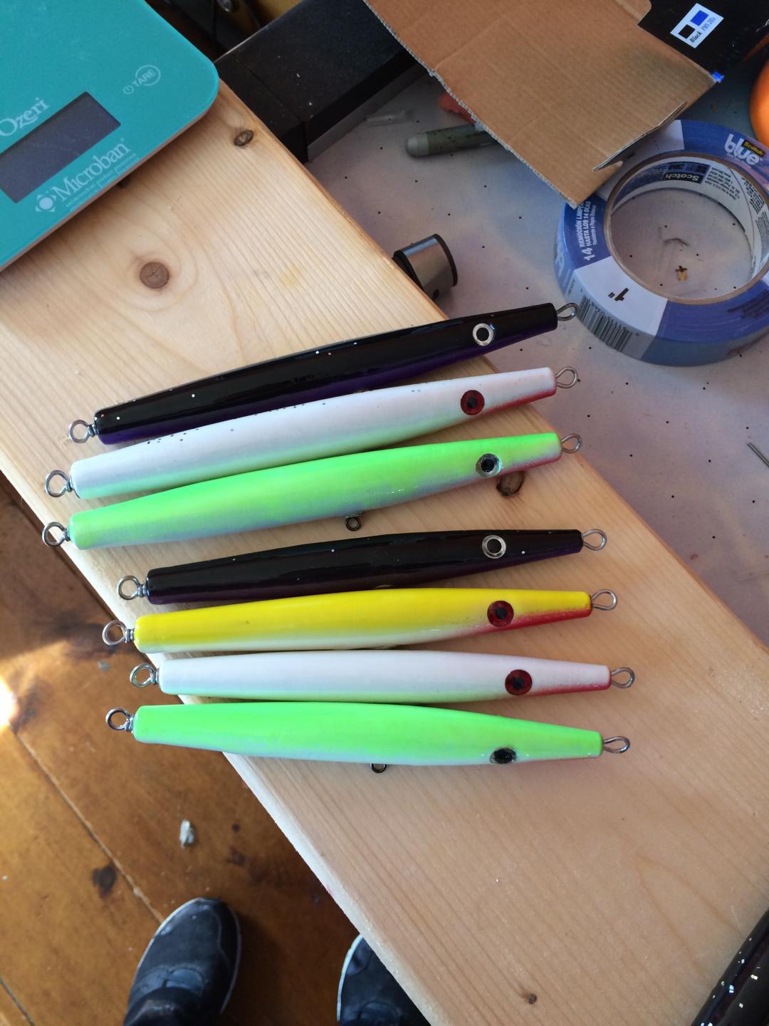 Last pic is a shorter/fatter proto type version of a needle I usually fish in the fall. I made 3 of these last year (top one is the original which I did well on and took apart and refinished. I made a few more to try in different colors. Those are around 2 1/4 oz.