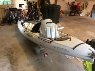 2008 Hobie Revolution Fish Kayak, Mirage pedal drive with New Turbo Fins, V2 Drive, Larger Sailing Rudder, Old style seat (Not Vantage), Humminbird 383c GPS/Fisherfinder, Scotty adjustable rod holder and recessed mount on right side, Removable Livewell with submersible SW pump) (lashes in with shock cord behind seat), Battery in Sealed battery box with 115V recharger, Rod holder , Hobie paddle, Dolly shown in picture NOT included. Kayak has great striper fishing mojo... several 40 to 45 inch stripers caught from this yak