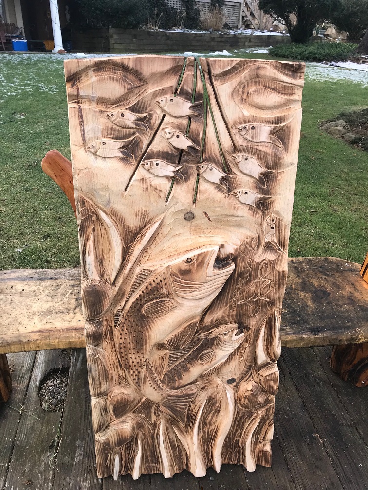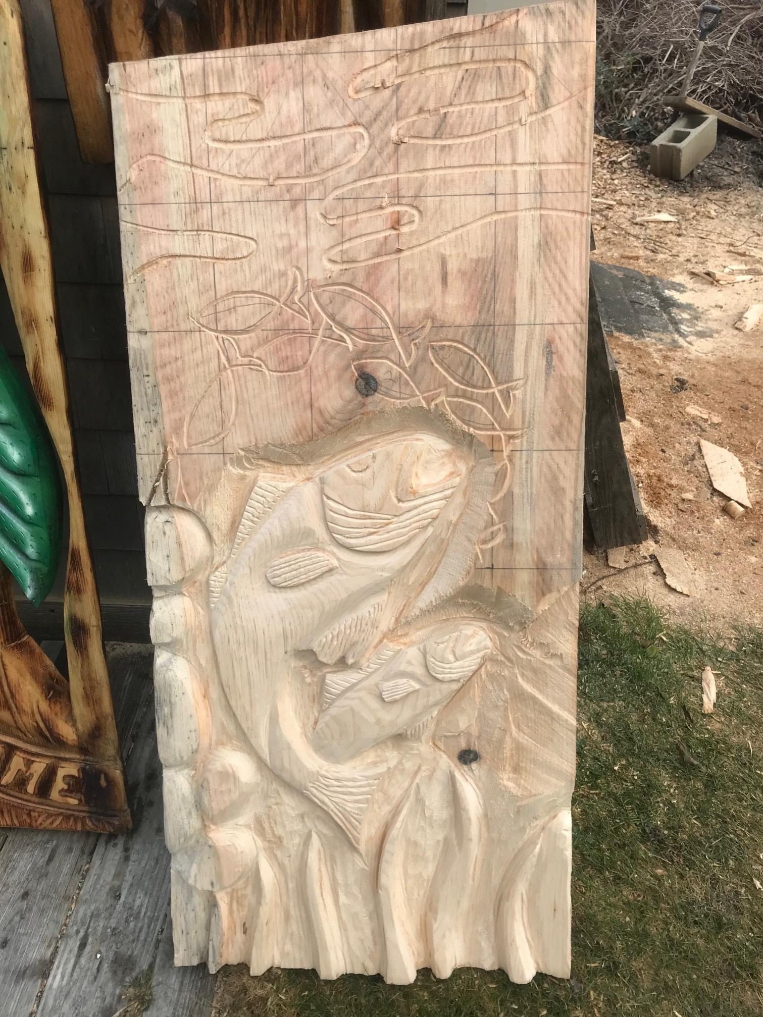 Figured it was time for a striped bass themed carving, trying a larger scale relief carving, stripers roughed out the school of bunker will be more of a challenge.