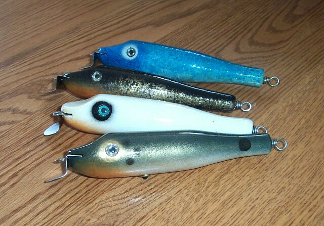 Goes a little over 4" and 2.5oz. Semi suspending lazy "S" pine minnow. NJT lefty lip works well on this casting bullet.