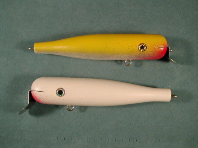 Here are a few atom jr. style guys I've squeezed in between the holiday parties.... They're all about 6" long, 1 1/8" diameter. These two have NJT#2 lefty lips, no weights. I'll be putting 2/0 VMC hooks on the belly and a big 5/0 EagleClaw 254 bucktail on the rear.