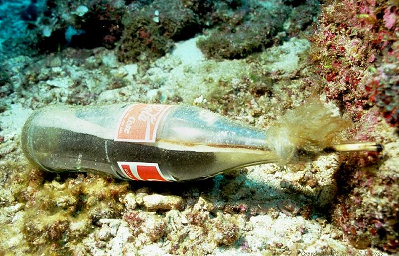 This one liter Coca-Cola bottle, found near one of the Capone islands, still shows a slightly burned fuse and explosive sediment inside. I was wondering how unstable the charge was at about the time my strobe discharged as I was taking this shot... needless to say I didn't disturb the bottle afterwards.