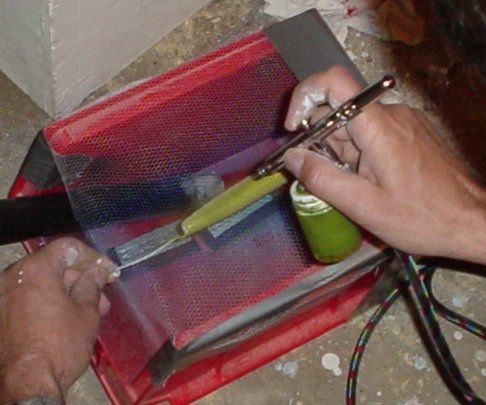 For real quick and simple scales, make up a scale jig. Take one of those plastic storage boxes (like you would store nuts and bolts in) that has an opening in the front. Stretch your scale mesh over top and attach to the sides. Duct tape works for this  Add a little weight to the bottom of the box. You can place the hose from your shop vac in this to suck up the over spray. To do the scales, paint your base color as usual and let dry. Once dry, stick the plug in the box (I usually have them with a piece of wire in the tail) and pull up so that the mesh wraps tight against the plug. Hit it lightly with your airbrush or spray can. Drop the plug down, flip, and pull the other side up on the mesh. Paint again. Scales in under 5 seconds