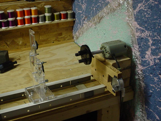 Useing that motor/set up is the way I wrap all my rods. I've done well over 100 and I can't see doing them any other way. You'll need that aluminum sleeve, it has two small allen keys and you'll also need the chuck. First you set the height of your rollers then center your motor to that height. In this pic of my old set-up I used wood it was solid , the setup I have now I bolted the motor on a peice of L shaped steel (bought @ homepot) I then screwed the L bracket to the wall. I also saved the wire setup from the old sewing machine. You can find any missing items at sewing machine repair shops. With little pratice thread FLY's off spools, you'll see.