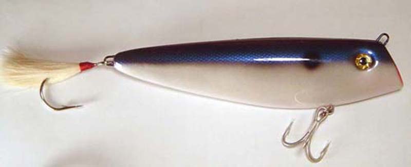 Made from cedar, length is 6 1/2 inches and weights 2.75oz. It's done with screw eyes epoxied in place. Because the body is so thin I decided to insert the weights (barrel weights) by drilling the holes through the body, from side to side, and fill the holes with bondo.
