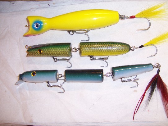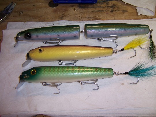 a trio "O" pikies, A giant jointed rainbow, a big blow special ( for windy conditions) made from maple, tail weighted and singel belly hook, and a oikie in pike scale..