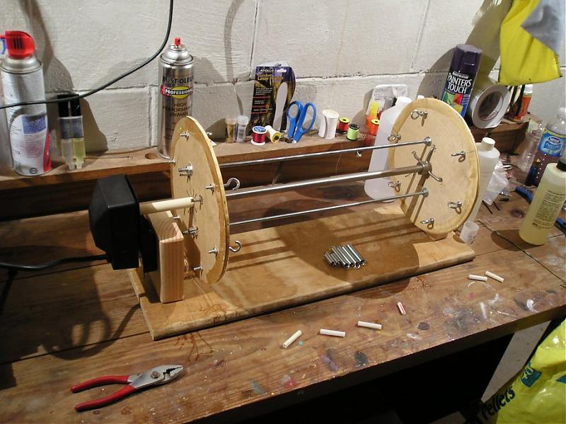 Here's a pic of my spinner, I just built it Saturday, and ran one batch of plugs through it. I am generally a cheap bastard, and I've been looking since last winter for a gearmotor to run the thing, but finally, I had plugs painted and it was time to etex them and so I went to Homies and bought a Charmglow grille rotisserie kit, and used the motor, brackets, and skewer pieces, and bought some springs and screweyes to finish it. It turns nice and slow, and is very quiet.