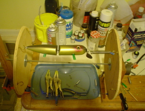 ??? When using the spinners w/ springs and eyes, do you coat the plug then put it into the spinner? By the pictures it seems a pain to brush the epoxy on in the drying positions. I'm still using my rod dryer with welding rod kabob method. That too is a pain at times the rod slips and pligs stand still . I try to epoxy when I'm around to babysit the spinning. I do like to eye and spring method.
