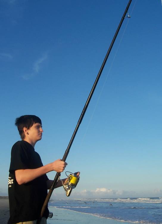 This is my son with the best performing set-up I have; Daiwa Basia reel with 20lb Sufix running line and 80lb Sufix braid casting leader, an All Star 1507 (13'-2", 2 - 6oz) with Fuji LCSG SiC Lowriders.