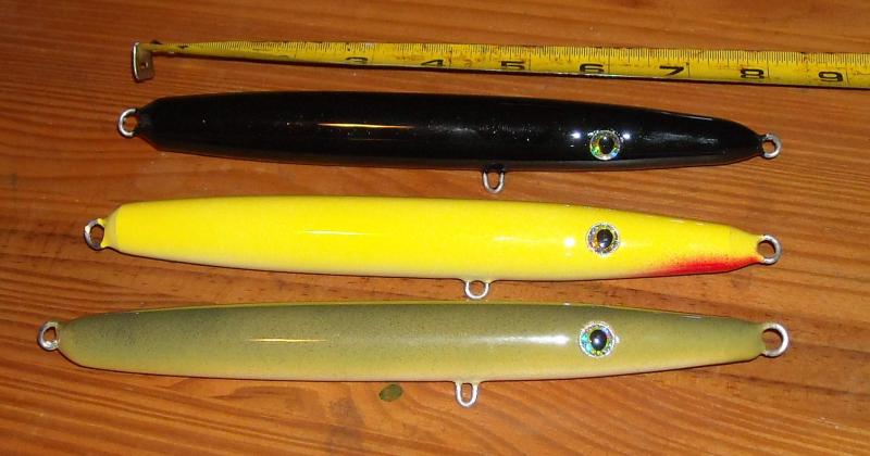 These are made from some of the white cedar fishdoc had at plugfest last year. Its nice working with true 2" wood, you can rip it and get 4 needles from each piece. The bodies on all of them are 7" although the extended ones I intentionally let the nose lead stick out past the end of the body so I could try & get a tapered look. the olive one came out good, next time i'll turn the nose a little smaller so I don't have as big a transition from the end of the wood to the wire...