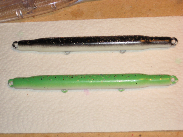 Tattoo, the vast majority of Carlezon's plugs were zinc/steel screw eyes, but he did through wire some, darters and jointed pikies. (I kept a supply of stainless eyes, and just about the 1st thing I would do with every one of his plugs was to remove the zinc eyes or they would get rustylike the one Mag has.) When Steve came by to grab those a few weeks back I was telling him a story about how George would make his own eyes out of copper from electrical wire. He was a machinist by trade, so he had made up a jig that he would put a short piece of wire into then pull a lever, and the lever action would engage the wire, make a loop for the eye then twist. He would then epoxy those into the plug - the jointed darter at the top of Steve's 1st pic looks like it has at least one to tie to. He was a Depression era kid, so he didn't let much go to waste.