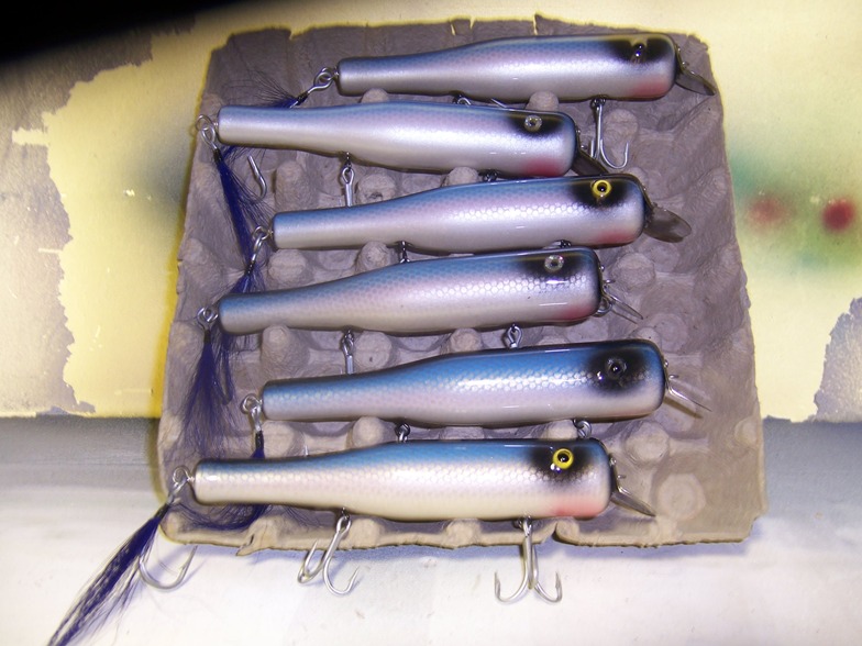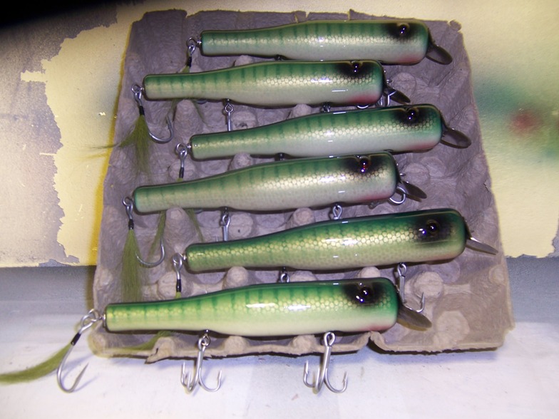 The big daddy is 8" and 1.25 in diameter. Weight is approx 3 oz. The husky dude 6" is the same diam and 2 1/4 oz. The mini is 1" and about 1 oz. The pic below of the lip is of a 8" big daddy. The 2 small swimmers are another swimming style of some real old ones I thought I would throw in. The other pic is some husky dudes.
